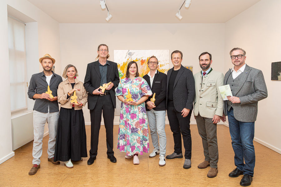 Kulturlandesrat Karlheinz Kornhäusl (6.v.l.) und Landtagsabgeordneter Stefan Resch (7.v.l.) gratulierten den diesjährigen Preisträgerinnen und Preisträgern der Landeskulturpreise und überreichten ihnen eine Mela-Skulptur.