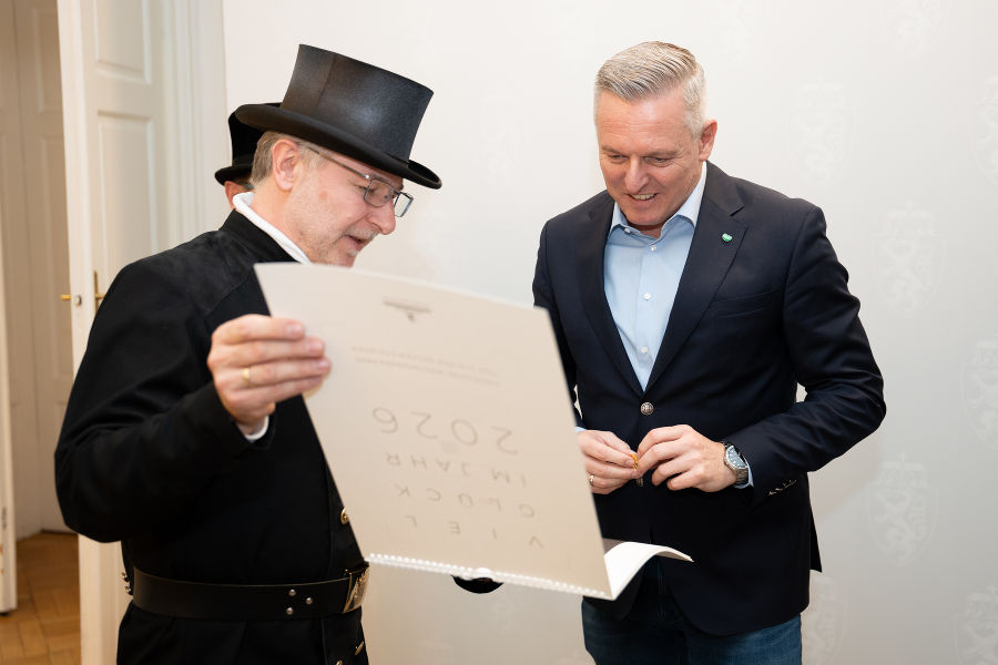 Graz (13. Februar 2026).- Ein bloßer Zufall war es, dass der verschobene Neujahrsbesuch der steirischen Rauchfangkehrer-Innung bei Landeshauptmann Mario Kunasek heute an einem Freitag, dem 13., nachgeholt wurde: Landesinnungsmeister Christian Plesar überbrachte gemeinsam mit seinen Stellvertretern Andrea Frais und Harald Haidler, Landesinnungsgeschäftsführer Johannes Weiss und mit den erfolgreichen Nachwuchs-Rauchfangkehrern Jonathan Karelly-Kogler und Tobias Helm (beide Sieger beim Landeslehrlingswettbewerb) angesichts des Tages ihre besonders guten Wünsche für ein glückliches neues Jahr.